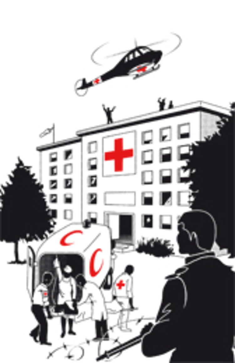 Ortsfeste (z. B. Krankenhäuser), mobile (z. B. Feldlazarette) Sanitätseinrichtungen, Sanitäter und Sanitätstransporte sind unter allen Umständen zu schonen. (Art. 19, 24, 35 I GA I; Art. 12; 21 ZP I; Art. 9 I; 11 ZP II) Dies schließt auch Lazarettschiffe und Sanitätsflugzeuge samt deren Personal ein. (Art. 22, 24, 25, 36, 38, 39 GA II; Art. 22-24 ZP I; Art. 11 ZP II) Sie sind deutlich mit dem jeweiligen Schutzzeichen, z.B. Rotes Kreuz auf weißem Grund, zu kennzeichnen. (Art.  38  GA  I) Gefangen genommenes Sanitätspersonal des Gegners erhält nicht den Status von Kriegsgefangenen, sondern wird, sofern es nicht zur medizinischen Versorgung der anderen Kriegsgefangenen benötigt wird, so schnell als möglich freigelassen. (Art. 28 I GA I; Art. 33 I GA III)